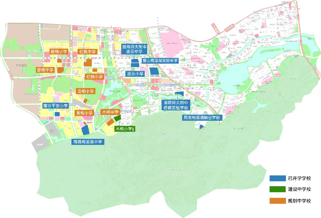 5所義務(wù)教育階段學(xué)校:湖南師大附中梧桐實(shí)驗(yàn)學(xué)校、湖南師大附中凌云中學(xué)、凌云小學(xué)、周南梅溪湖映日學(xué)校、麓谷平安小學(xué);2所優(yōu)質(zhì)高中:麓山梅溪湖實(shí)驗(yàn)中學(xué)、南雅梅溪湖中學(xué)。